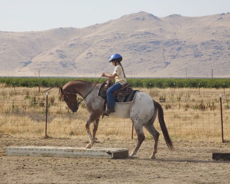 College of the Sequoias Equestrian Team member & JBar staffer Michelle Stacey helps Cambria Wright, 6th grader, ride "Robbie."